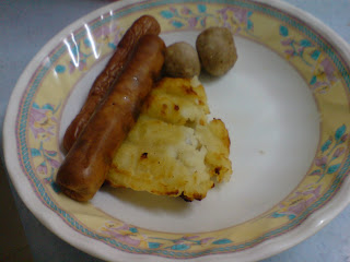 我煮了白饭,鱼片,sausage and meatball...